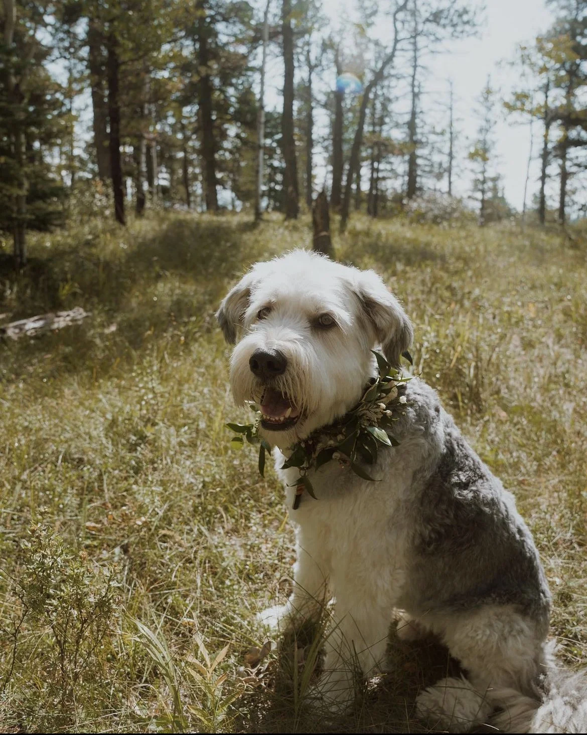Glory & Blake headed off into the Mountains for their intimate ceremony with their pup. Mac was adorned in a collar with greenery, anemones and wax flower. His cuteness stole the show!